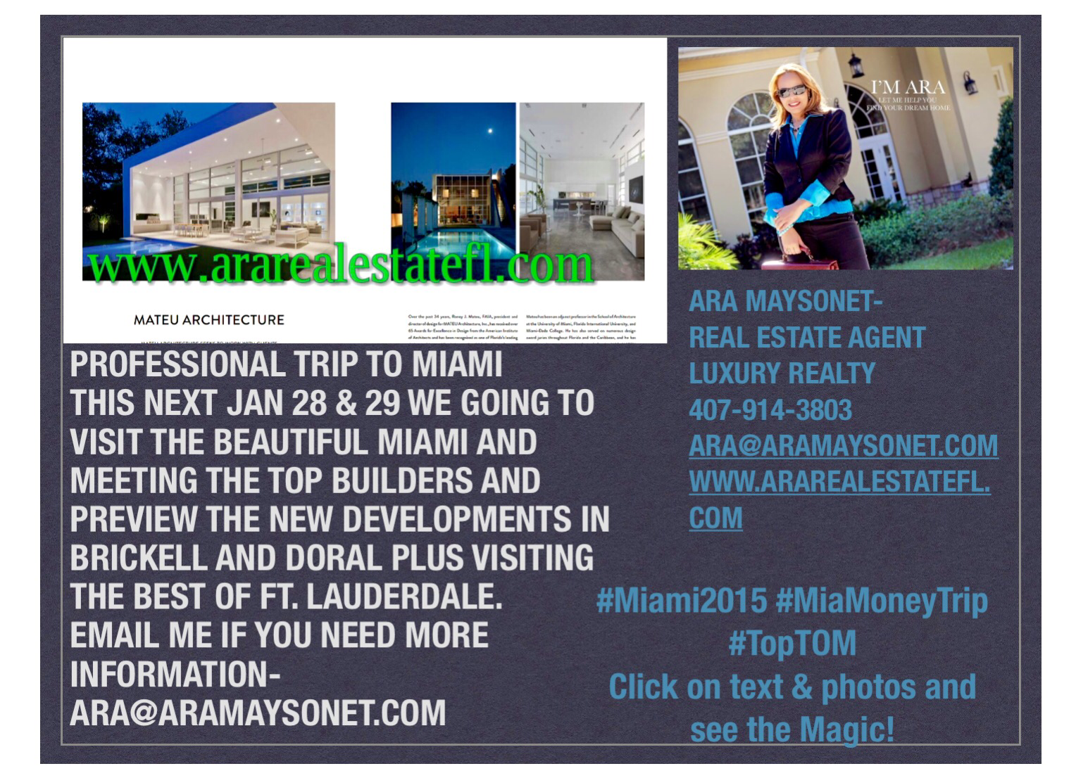Miami #Event ! Start Tomorrow, I will have 9 meetings with the #TopBuilders of the Beautiful #Miami. I will be Previewing some of the most #Amazing Developments that I will be visiting. I only have one day 1/2 of Just Work and Meet the Best of the Best. If you like more information, contact me at ara@aramaysonet.com or visit my web for more details. #Miami2015 #MiamiTopTrip #realestate #Florida #USA #UK @ararealtor #Topagents #luxuryrealty #TeamTOM